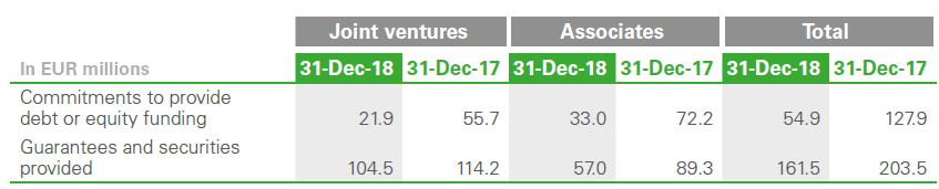 The notional amount of guarantees and securities provided on behalf of participating interests in joint ventures and associates, which is also included in ratios, decreased from EUR 91.6 million at 31 December 2017 to EUR 86.6 million at 31 December 2018. Of this amount, nil was recognized in the statement of financial position (2017: EUR 0.1 million). Reference is also made to note 5.5.