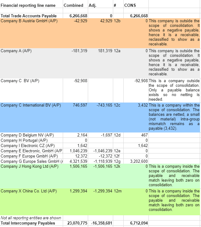 An live example of eliminating intra-group receivables and intra-group payables is shown below. The consolidation represents a Dutch holding company preparing consolidated financial statements for this holding company (the parent) and its subsidiaries (a sub-consolidation). The holding company and its subsidiaries are part of an USA listed multinational that also prepares consolidated financial statements of the worldwide group.
