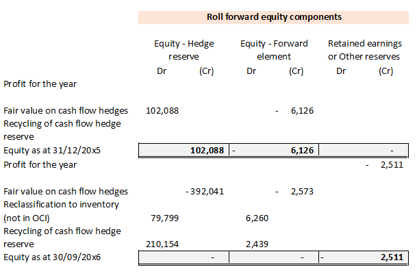 - Change in fair value of the forward points (‘the forward element’) is recognised in other comprehensive income (and in the cost of hedging reserve in equity) to the extent that it relates to the hedged item.