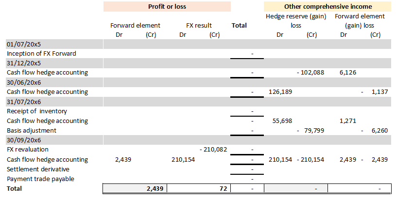 Key features: Spot rate designated, Basis adjustment required for inventory, Cost of hedging approach elected – Forward points taken to OCI, Inclusion of time value of money in measuring hedge ineffectiveness