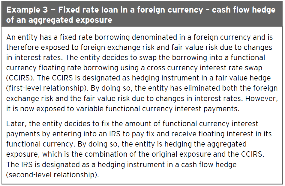 The concept of hedging aggregated exposures as such is straightforward. However, the accounting for such relationships includes some (necessary) complexity. The accounting mechanics are explained in detail in the illustrative examples in paragraphs IE7-IE39 of the implementation guidance of IFRS 9. In the last example above, where an entity has a cash flow hedge in the first-level relationship that is then designated as the hedged item in a fair value hedge, the cross-currency interest rate swap is both a hedging instrument and part of a hedged item at the same time but in different hedging relationships. Its fair value changes are recognised in OCI, but at the same time, should also offset the fair value changes in profit or loss of the interest rate swap in the second-level relationship. This requires a reclassification of the amounts recognised in OCI to profit or loss (to the extent they relate to the second-level relationship) to achieve the offset in the fair value hedging relationship. Hedges of exposures affecting OCI