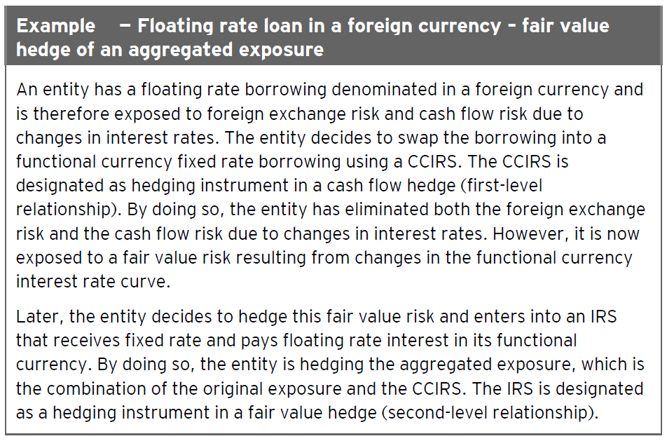 As an aggregated exposure is a combination of an exposure and a derivative, the aggregated exposure is often a hedging relationship itself (the first-level relationship). IFRS 9 only requires the first-level relationship to be one that could qualify for hedge accounting. The application of hedge accounting for the first-level relationship is not required in order to qualify for hedge accounting for the aggregated exposure. However, applying hedge accounting to the aggregated exposure is more complex when hedge accounting is not applied to the first-level relationship.