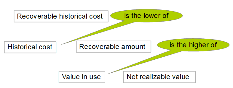 For an item of stock (or inventory), value in use is not normally relevant, so the usual formula is the lower of historical cost and net realisable value. For a fixed asset in profitable use, net realisable value is not normally relevant, so the usual question is: which is the lower of historical cost and value in use? Sometimes fair value is used instead of either recoverable amount or one of its elements.