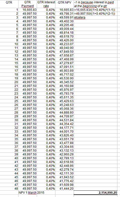 The net present value is therefore € 2,154,990.20 (see below). This is the amount of the lease liability at the commencement of the lease contract, which is also the amount to record the right-to-use asset.