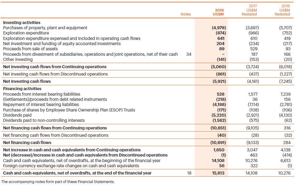 BHP Billiton Consolidated cash flows Financing and Investing 2018