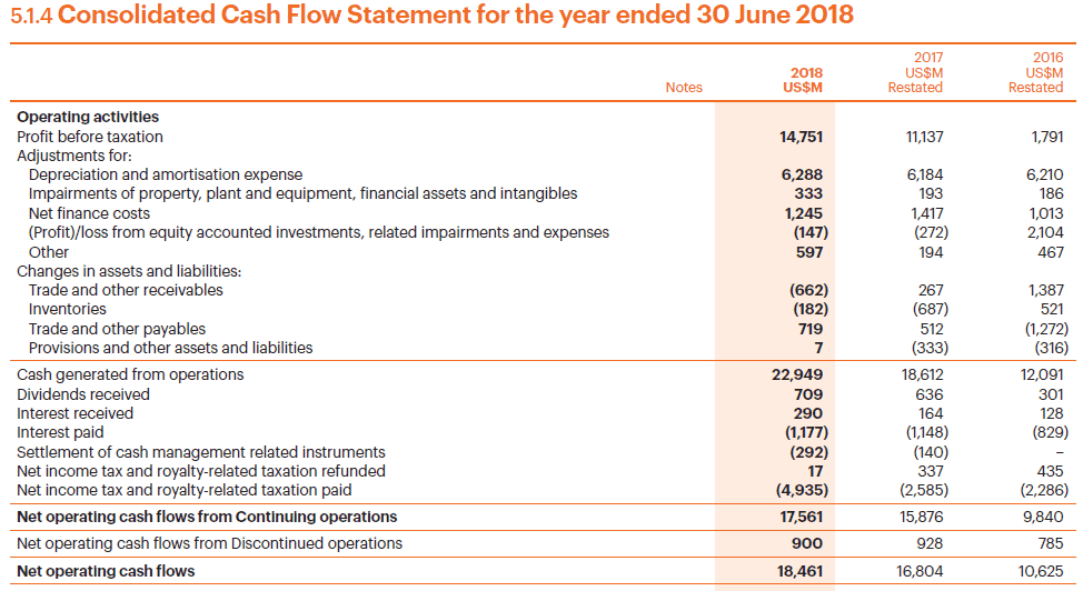 BHP Billiton consolidated operating cash flows 2018