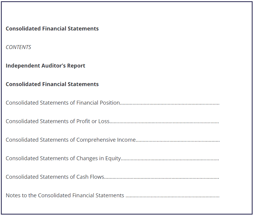 In practice, the (Consolidated) Financial Statements are part of a larger booklet, for example, called Annual Report. The Annual Report’s high level content is for example: