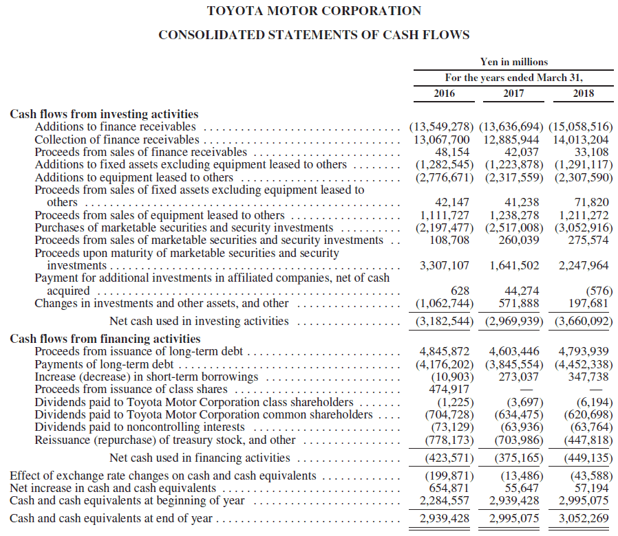 Toyotal consolidated financing investing and cash flows 2018