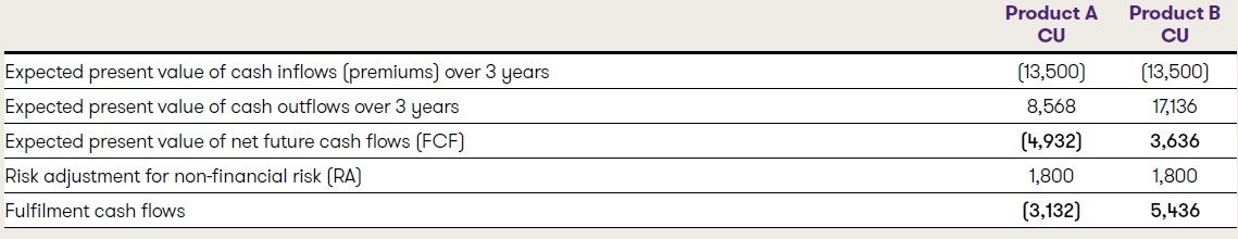 An entity issues 100 three-year contracts of product A and 50 three-year contracts of product B with the following terms.