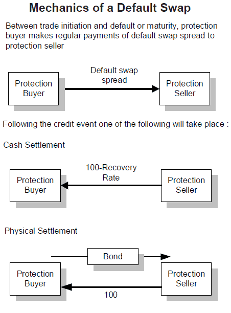 The first two choices are shown in Mechanics of a default Swap above. If the protection seller has the view that either by waiting or by entering into the work-out process with the issuer of the reference asset he may be able to receive more than the default price, he will prefer to specify physical delivery of the asset.