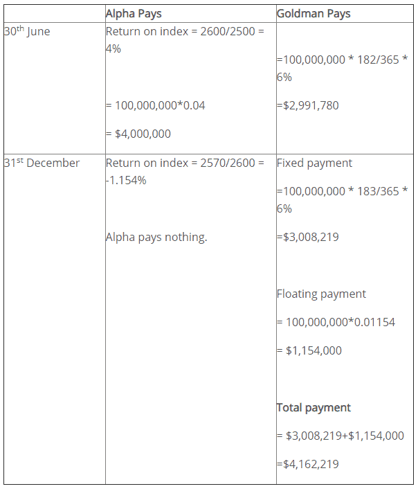 Let’s see how the cash flows turn out in the first year. At the beginning, the S&P Total Return Index was at 2500 level, on 30th June it was 2600, and on 31st December it was at 2570. Let’s look at the cash flows in both the legs of the transaction.