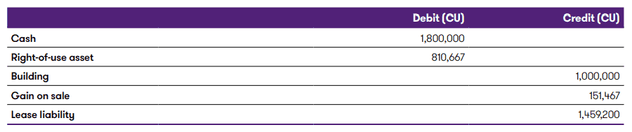 The present value of the annual payments (18 payments of CU120,000, discounted at 4.5%) is CU1,459,200. SellCo measures the right-of-use asset retained through the leaseback as a proportion of the previous carrying amount of the building. This is calculated as: CU1,000,000 (previous carrying value) x [CU1,459,200 (PV of lease payments)/ CU1,800,000 (fair value of building)]. The right-of-use asset calculated in this way is CU810,667. SellCo recognises a portion of the total gain on the sale, to the extent it relates to the rights retained in the underlying asset by BuyCo at the end of the leaseback. The total gain on sale of building is CU800,000 (CU1,800,000 – CU1,000,000). This total is split into:
