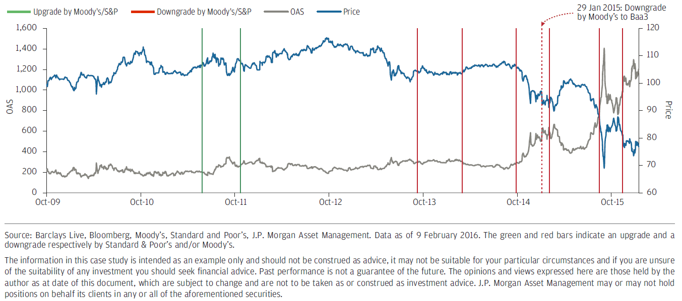 The potential impact of the introduction of an ECL calculation on investment strategy can be illustrated by looking at bonds issued by Petrobras, the Brazilian oil group. Take, for example, “PETBRA 5.75% 20 January 2020”—a USD 2.5 billion 10-year senior unsecured bond issued by Petrobras with a 5.75% coupon on 30 October 2009. The ECL requirements