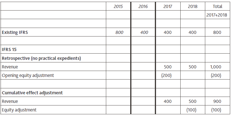 The cumulative effect adjustment of 100 is calculated as the difference as at 1 January 2017 between the cumulative amount of revenue recognised in accordance with existing IFRS (1,600, being 800 in 2014 and 400 in each of 2015 and 2016) and the amount that would have been recognised in accordance with IFRS 15 (1,500).