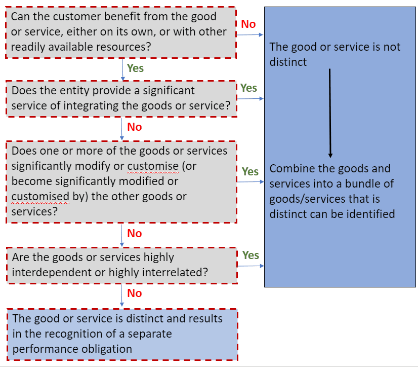 The two criteria that need to be met in order for a good or service to be distinct are set out in more detail below (see performance obligation):